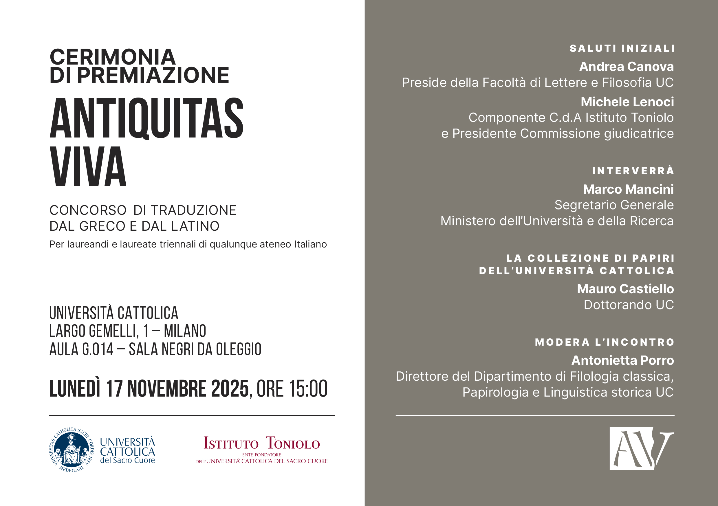 Si informa che lunedì 17 novembre alle ore 15.00 presso la sede di Milano dell’Università Cattolica si terrà la cerimonia di premiazione dei vincitori del Concorso Antiquitas Viva 2025.